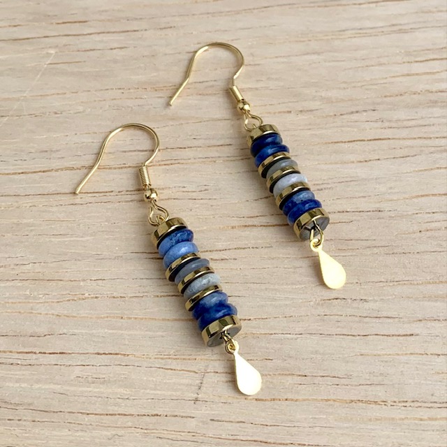 Brinco banhado confeccionado com pedras Sodalita e Hematita dourada