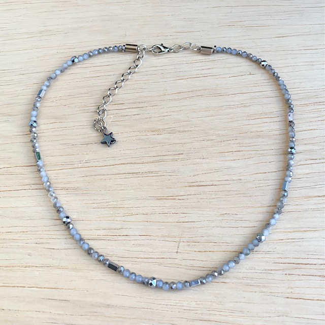 Colar chocker confeccionado com cristais de vidro e pedra Hematita prateada.