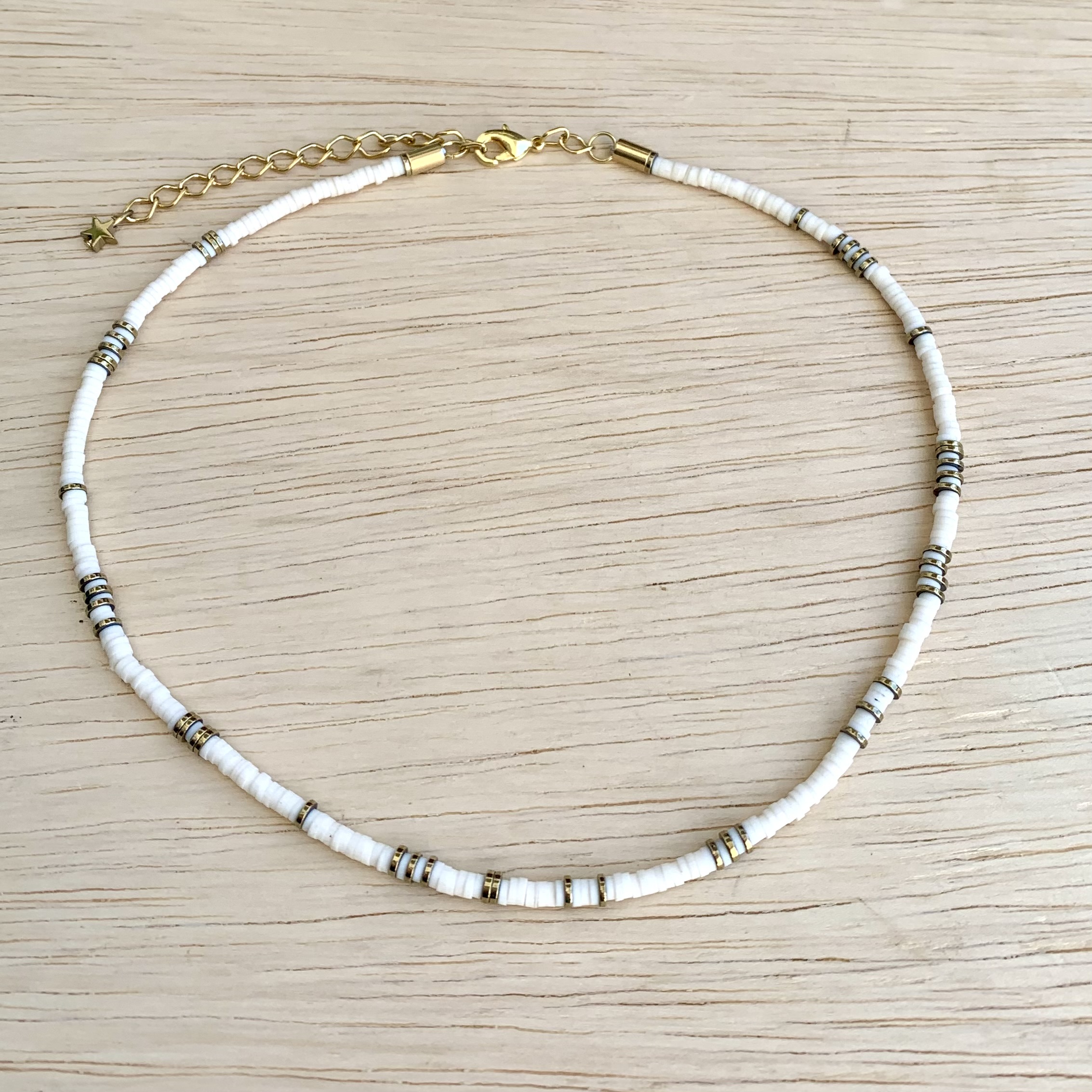 Colar curto, confeccionado com discos emborrachados e pedra Hematita. Possui regulagem de tamanho, podendo usar curto ou mais longo,