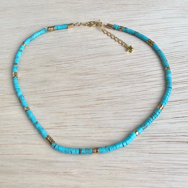 Colar curto confeccionado com pedras Turquesa e Hematita dourada.