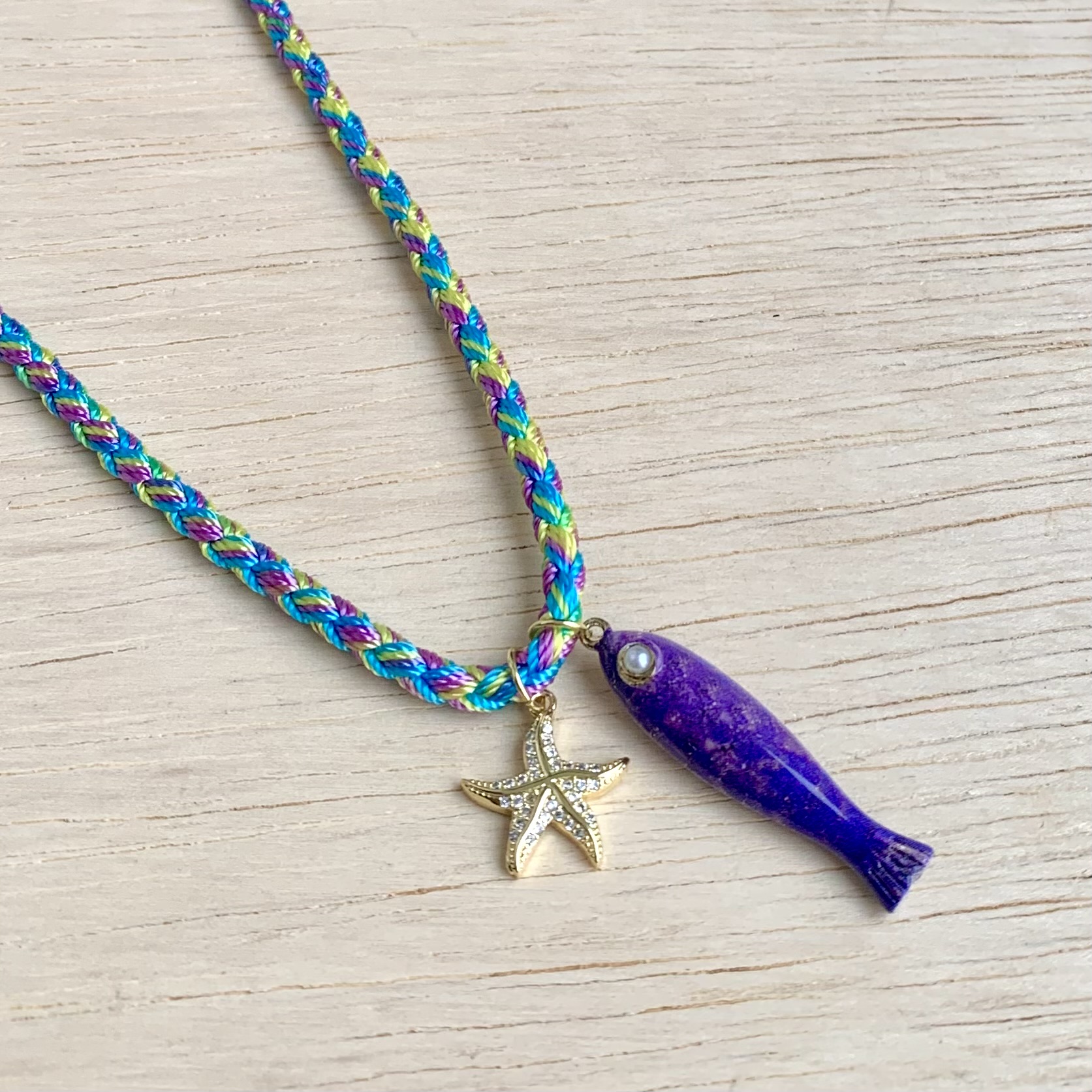 Colar médio confeccionado com cordão marroquino e pingentes de peixe esmaltado e estrela do mar com zircônia