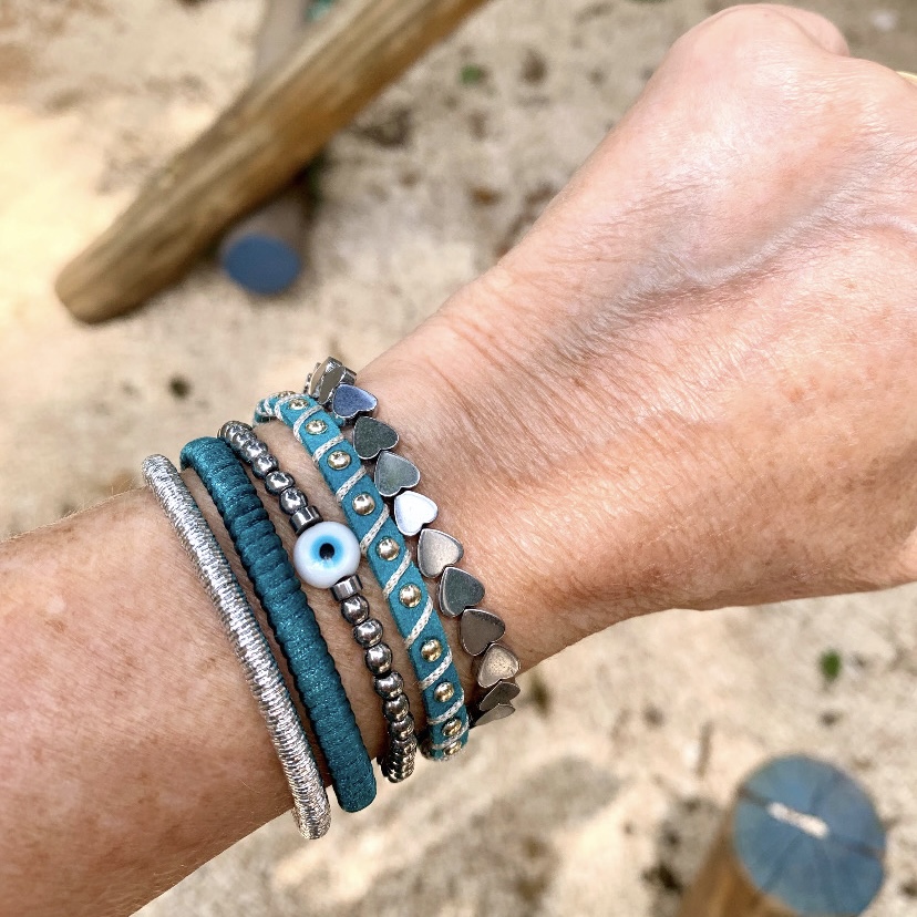 Pulseira Cordão Metálico, pulseira Cordão de Seda, pulseira Olho Grego Hematita prateado, pulseira Mini Corações e pulseira Apache Camurça.